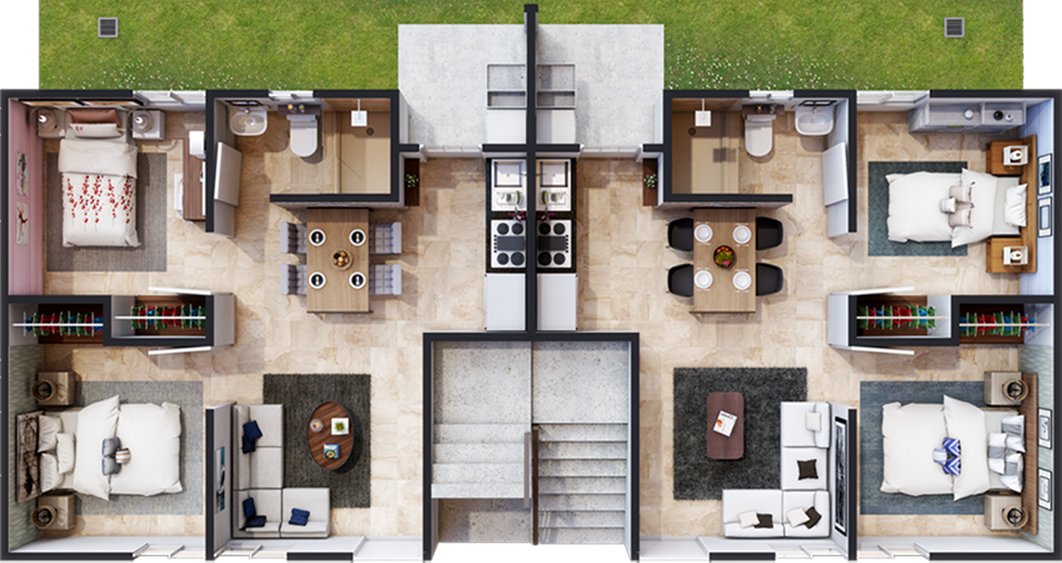 y edificios de 3 niveles, cada nivel con 2 departamentos